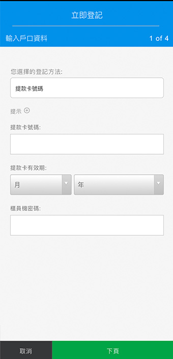 個人銀行客戶 憑提款卡登記 輸入您的提款卡號碼、有效期限及櫃員機密碼。