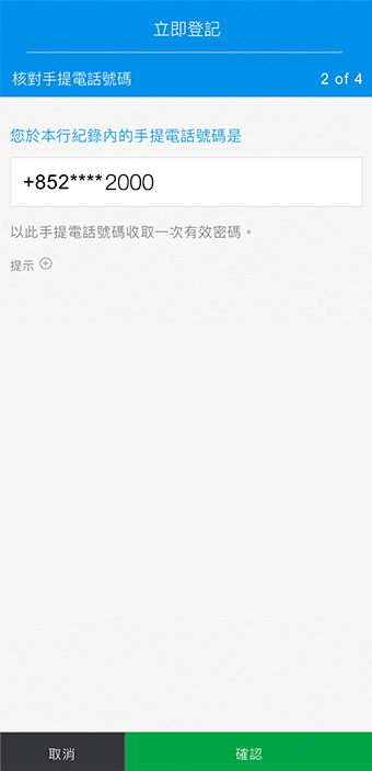 確認您在本行登記的手提電話號碼,您會收到內有一次有效密碼的短訊。
