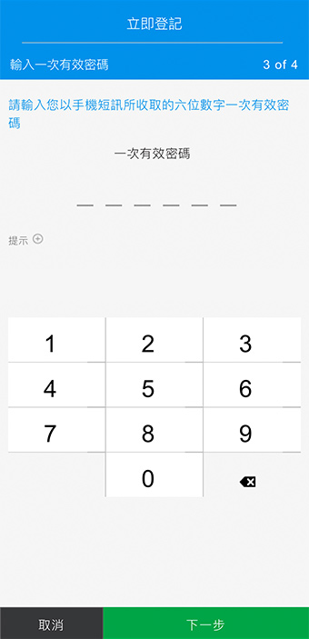 輸入以短訊或電郵發送的「一次有效密碼」(OTP)以驗證登記。