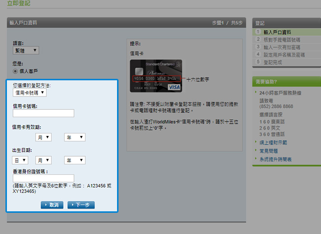 信用卡客戶 憑信用卡登記 輸入您的信用卡號碼、有效期限、出生日期及香港身份證號碼。
