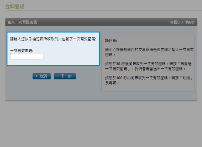 輸入從手機短訊所收取的「一次有效密碼」。