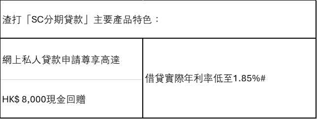 有計劃地利用私人貸款,是為未來鋪設您想生活的好選擇。以渣打私人貸款為例,實際年利率低至1.85%¹,還款期最高為60個月,更可提供高達月薪18倍或HK$4,000,000的貸款額² ,同時送上豐富現金回贈及迎新優惠。此外,申請最快5分鐘獲批核,助您把握每分每秒! 您可以利用我們的私人貸款計算機,按個人需要選擇還款期等資料,自行計算出每月實際還款額及平均每月利息。全程網上輕易完成貸款批核申請,特選客戶更可獲免遞交文件(免入息證明、免tu),秒速過數,更有不定期的各種推廣優惠。